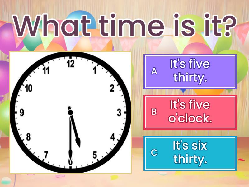 1) What time is it? a) It's ten o'clock. b) It's seven o'clock. c) It's twelve o'clock. 2) What time is it? a) It's six o'clock. b) It's ten o'clock. c) It's eleven o'clock. 3) What time is it? a) It's eleven thirty. b) It's eleven o'clock. c) It's three o'c lock. 4) What time is it? a) It's eight o'clock. b) It's one thirty. c) It's eight thirty. 5) What time is it? a) It's two o'clock. b) It's four thirty. c) It's four o'clock. 6) What time is it? a) It's eleven thirty. b) It's ten thirty. c) It's eleven o'c lock. 7) What time is it? a) It's one thirty. b) It's one o'clock. c) It's two thirty. 8) What time is it? a) It's five o'clock. b) It's six thirty. c) It's five thirty. 9) What time is it? a) It's seven o'clock. b) It's seven thirty. c) It's eight o'clock. 10) What time is it? a) It's three o'clock. b) It's two thirty. c) It's three thirty. 11) What time is it? a) It's two fifteen. b) It's two thirty. c) It's one forty five. 12) What time is it? a) It's five forty five. b) It's three forty five. c) It's four forty five.