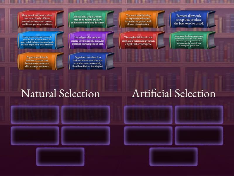 Natural Selection: Over a period of several thousands years the deer mice that live in the sandy soil of Nebraska developed a pale coat that helped them evade predators., Organisms best adapted to their environment survive and reproduce more successfully than those that are less adapted., Bacteria that develop a mutation that allows them to survive an antibiotic will live long enough to reproduce and so spread the 'survival' gene to subsequent generations., The angler fish lives in the deep, dark ocean and produces a light that attracts prey., Populations of lizards that have a certain trait become more numerous after a change in climate., Artificial Selection: The intentional breeding of organisms by humans to produce organisms with desired characteristics., Many varieties of tomatoes have been created to be different sizes, colors, tastes, and tolerant to different growing conditions., Farmers allow only sheep that produce the best wool to breed., Alaskan Sled dogs have been bred to be healthy and have endurance to run long distances., The Belgian Blue cattle was created to be extremely muscular, therefore providing lots of beef.,