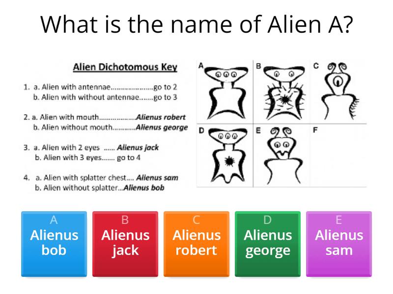 1) What is the name of Alien A? a) Alienus bob b) Alienus jack c) Alienus robert d) Alienus george e) Alienus sam 2) What is the name of Alien B? a) Alienus bob b) Alienus jack c) Alienus robert d) Alienus george e) Alienus sam 3) Which tree does the unknown leaf come from? a) Ungnadia speciosa b) Sophora secundiflora c) Salix nigra d) Quercus laceyi 4) Which mollusk moves by jet propulsion and does not have an external shell? a) Squid b) Slug c) Nautilus d) Snail