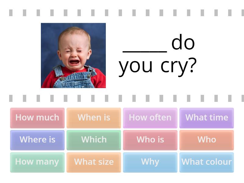 Why - _____ do you cry?, Who is - ______ older?, What size - _____ are you?, Which - _______ bus do you take?, How often - ________ do you go camping?, Where is - ______ my key?, How many - _______ sweets do you have?, Who - ______ runs faster?, What time - ______ is it?, What colour - ______ is your bag?, How much - ______ oil is there?, When is - _____ your birthday party?,