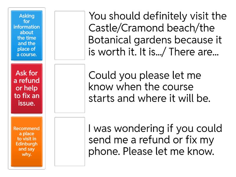Asking for information about the time and the place of a course. - Could you please let me know when the course starts and where it will be., Ask for a refund or help to fix an issue. - I was wondering if you could send me a refund or fix my phone. Please let me know., Recommend a place to visit in Edinburgh and say why. - You should definitely visit the Castle/Cramond beach/the Botanical gardens because it is worth it. It is.../ There are...,