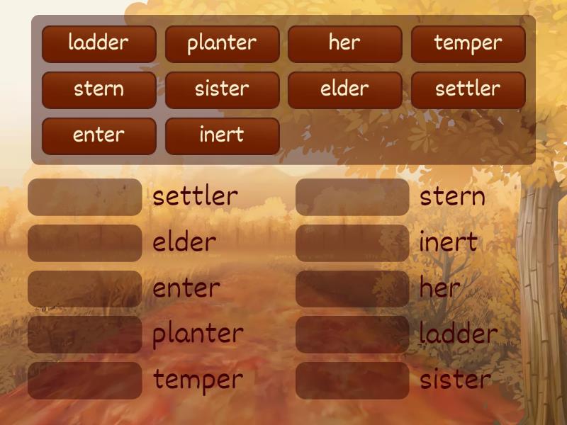 inert - inert, ladder - ladder, settler - settler, sister - sister, her - her, elder - elder, stern - stern , enter - enter, temper - temper, planter - planter,