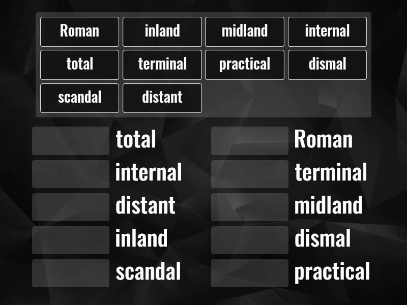 dismal - dismal, inland - inland, midland - midland, Roman - Roman, terminal - terminal, total - total, distant - distant, scandal - scandal, practical - practical, internal - internal,