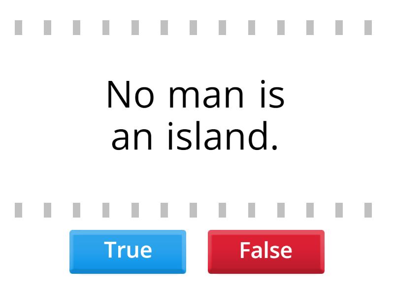 True: No man is an island. , Life is a box of chocolates. , Ryan is a tall giraffe. (human), Children are sponges. , The fire was a monster. , Some people are monsters. , The city is a jungle. , Bob is a brick wall. , False: The sky is blue., The stars are playing tennis in the sky. , Ryan is a tall giraffe. (Ryan is the actual name of the giraffe), Children use sponges to clean. , The fire was huge. , Some people are not nice. , The Earth is flat., Bob builds brick walls.,