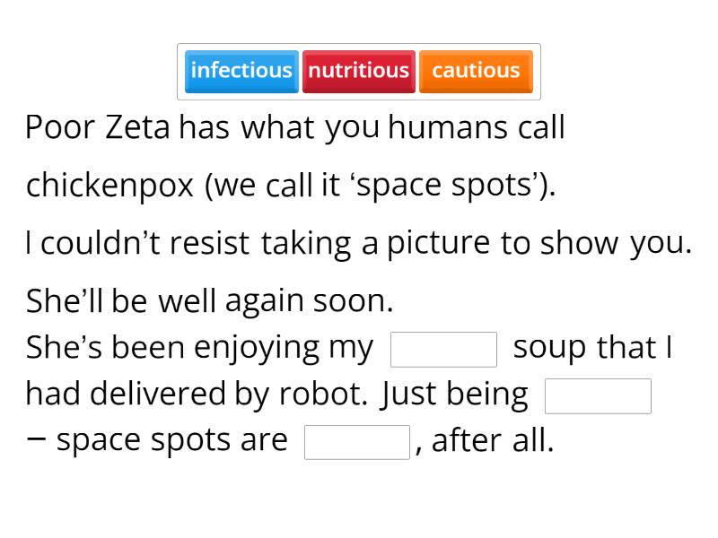 Poor Zeta has what you humans call chickenpox (we call it ‘space spots’). I couldn’t resist taking a picture to show you. She’ll be well again soon. She’s been enjoying my ____ soup that I had delivered by robot. Just being ____ – space spots are ____, after all.