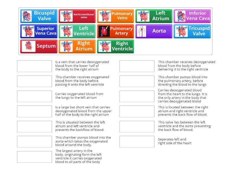 Left Atrium - This chamber receives oxygenated blood from the body before passing it onto the left ventricle, Left Ventricle - This chamber pumps blood into the aorta which takes the oxygenated blood around the body., Right Ventricle - This chamber pumps blood into the pulmonary artery, before directing the blood to the lungs, Tricuspid Valve - This is located between the right atrium and right ventricle and prevents the back flow of blood., Aortic/semilunar valve - This valve lies between the left ventricle and the aorta preventing the back flow of blood., Pulmonary Veins - Carries oxygenated blood from the lungs to the left atrium, Superior Vena Cava - Is a large but short vein that carries deoxygenated blood from the upper half of the body to the right atrium, Aorta - The largest artery in the body, originating form the left ventricle it carries oxygenated blood to all parts of the body, Bicuspid Valve - This is situated between the left atrium and left ventricle and prevents the backflow of blood., Septum - Seperates left and right side of the heart, Pulmonary Artery - Carries deoxygenated blood from the heart to the lungs. It is the only artery in the body that carries deoxygenated blood, Inferior Vena Cava - Is a vein that carries deoxygenated blood from the lower half of the body to the right atrium, Right Atrium - This chamber receives deoxygenated blood from the body before delivering it to the right ventricle,