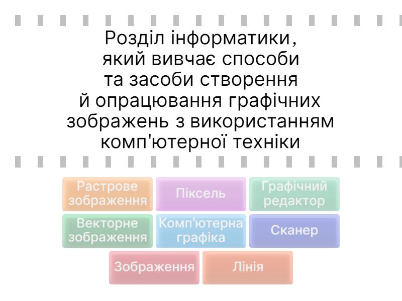 Комп'ютерна графіка - Розділ інформатики, який вивчає способи та засоби створення й опрацювання графічних зображень з використанням комп'ютерної техніки, Зображення - Основний об'єкт комп'ютерної графіки, Растрове зображення, Векторне зображення, Піксель, Сканер, Графічний редактор, Лінія - Найдрібніший елемент векторного зображення,