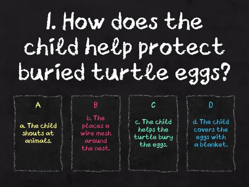 1) 1. How does the child help protect buried turtle eggs? a) a. The child shouts at animals. b) b. The places a wire mesh around the nest. c) c. The child helps the turtle bury the eggs. d) d. The child covers the eggs with a blanket. 2) 2. After the hatchlings hatch, how long does it take them to get to the surface of the sand? a) a. a few seconds b) b. a few minutes c) c. one day d) d. three days 3) 3. Turtle crawls toward the street because a) a. the ocean was too noisy b) b. all turtles crawl the same direction c) c. she smells food coming from that direction d) d. the brightest light is coming from that direction 4) 4. How does Turtle get out of a shrimper's net? a) a. a fisherman lets her out b) b. another turtle helps her get out c) c. she bites a hole through the net d) d. she slips through the hatch sewn onto the net 5) 5. Where does Turtle go to lay her eggs? a) a. back to the same beach where she hatched b) b. in between rocks and on an island c) c. at the bottom of the ocean d) d. to the nearest beach