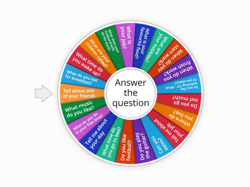 What do you eat for breakfast?, What time do you wake up?, What are your children called?, What does your husband/wife do for work?, What is your job?, What is your favourite food?, What are your hobbies?, When do you start work?, When do you finish work?, Do you like watching TV? - What do you watch?, Do you go out much?, Where do you live?, Tell me about your job, Can you swim?, Do you play the guitar?, Do you like football?, What time do you go to bed?, Tell me about your day, What do you do in your free time?, What music do you like?, Tell about one of your friends.