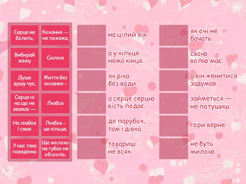 У нас така поведінка: - де парубок, там і дівка., Кохання — не пожежа, - займеться — не потушиш., Вибирай жінку - на цілий вік., Силою - не буть милою., Ще молоко на губах не обсохло, - а він женитися задумав., Серце ні на що не вважає — - свою волю має., Любов - гори верне., На любов і смак - товариш не всяк., Любов - це кільце, - а у кільця нема кінця., Душа душу чує,  - а серце серцю вість подає., Серце не болить, - як очі не бачать., Життя без кохання - - як ріка без води.,