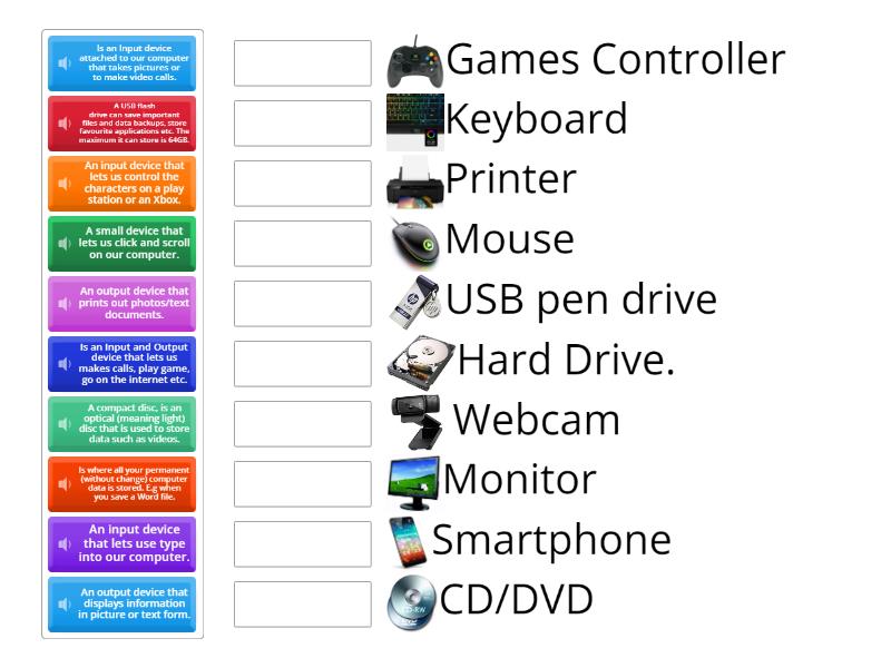 Is where all your permanent (without change) computer data is stored. E.g when you save a Word file. - Hard Drive., A compact disc, is an optical (meaning light) disc that is used to store data such as videos. - CD/DVD, A USB flash drive can save important files and data backups, store favourite applications etc. The maximum it can store is 64GB. - USB pen drive, Is an Input device attached to our computer that takes pictures or to make video calls. - Webcam, Is an Input and Output device that lets us makes calls, play game, go on the internet etc. - Smartphone, An output device that displays information in picture or text form. - Monitor, A small device that lets us click and scroll on our computer. - Mouse, An input device that lets use type into our computer. - Keyboard, An output device that prints out photos/text documents. - Printer, An input device that lets us control the characters on a play station or an Xbox. - Games Controller,