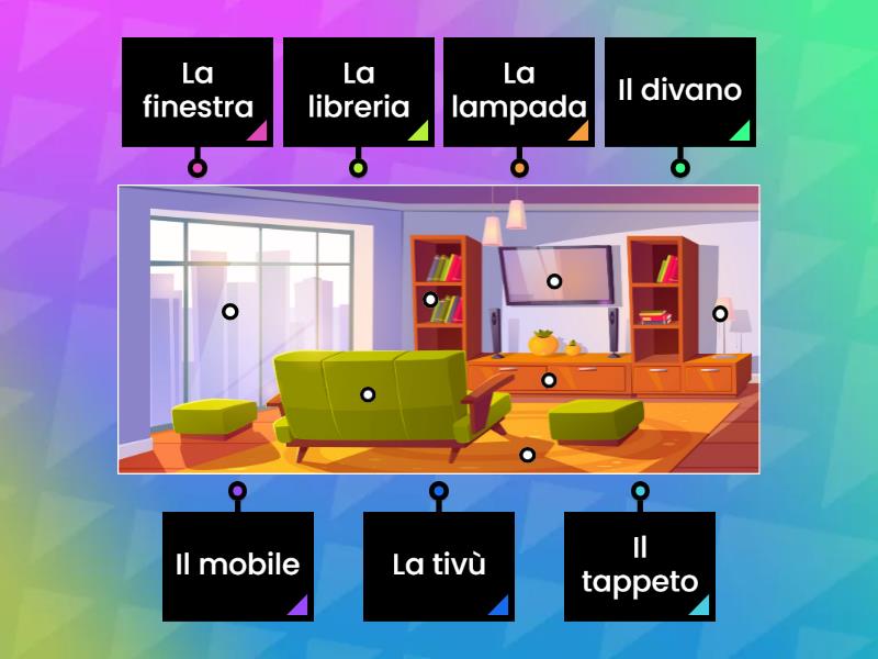 Il divano, La finestra, La tivù, La libreria, Il tappeto, Il mobile, La lampada.