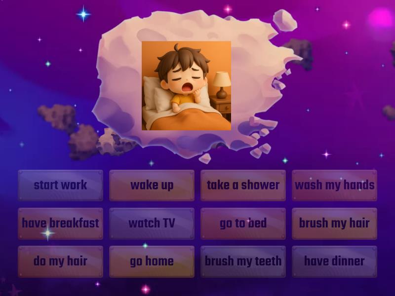 wake up, brush my teeth, go to bed, take a shower, have dinner, have breakfast, go home, start work, do my hair, brush my hair, watch TV, wash my hands,