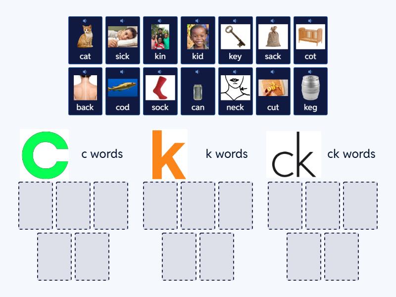 c words: can, cot, cut, cat, cod, k words: key, kid, kin, keg, ck words: sack, sock, sick, back, neck,