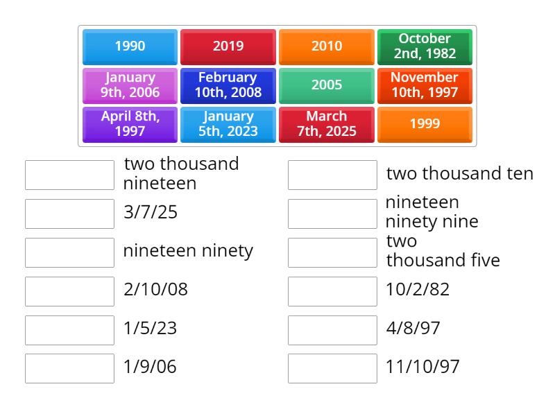 2010 - two thousand ten, 1999 - nineteen ninety nine, 2005 - two thousand five, 2019 - two thousand nineteen, 1990 - nineteen ninety, January 5th, 2023 - 1/5/23, April 8th, 1997 - 4/8/97, October 2nd, 1982 - 10/2/82, March 7th, 2025 - 3/7/25, November 10th, 1997 - 11/10/97, January 9th, 2006 - 1/9/06, February 10th, 2008 - 2/10/08,