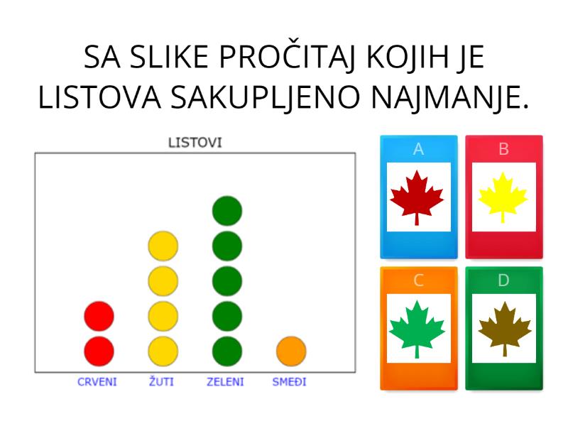 1) SA SLIKE PROČITAJ KOJIH JE LISTOVA SAKUPLJENO NAJMANJE. a) b) c) d) 2) IZ TABLICE PROČITAJ KOLIKO JE SAKUPLJENO ZELENIH LISTOVA. a) b) c) d) e) 3) SJEDI LI DJEČAK ISPRAVNO? a) DA b) NE 4) SJEDI LI DJEVOJČICA ISPRAVNO? a) DA b) NE 5) ZA VRIJEME RADA NA RAČUNALU, VAŽNO JE POVREMENO SE RAZGIBATI. a) DA b) NE