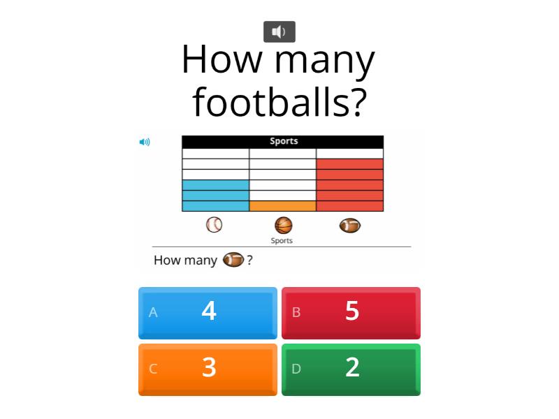 1) How many footballs? a) 4 b) 5 c) 3 d) 2 2) How many fish? a) 5 b) 4 c) 3 d) 2 3) Which has the most?  a) b) 4) Which has the least? a) b) 5) How many juice boxes? a) 5 b) 2 c) 8 6) How many pink flowers? a) 4 b) 1 c) 5 7) Which has the fewest? a) b) 8) Which has the most? a) b) 9) How many vanilla ice cream cones? a) 3 b) 6 c) 2 10) How many trains? a) 8 b) 6 c) 7 11) How many fish? a) 6 b) 4 c) 5 12) Which has the least? a) b)