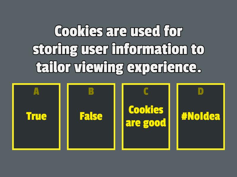 1) Cookies are used for storing user information to tailor viewing experience. a) True b) False c) Cookies are good d) #NoIdea 2) Which is not a type of impact technology can have based on TGTT? a) Learning b) Marketing c) Storytelling d) Making 3) Which is not something to consider for asynchronous learning? a) High standards for videos b) Paying attention to ESL c) Putting students in cohorts d) Emphasize relationships 4) Which is not an example of an NFT (non-fungible token)? a) Secret password for Zelda b) A special item of Fortnight c) Bitcoin d) Digital Concert Tickets 5) Which is not a place to find new templates? a) SlidesCarnival b) Slidesgo c) Slide-a-palooza d) SlideShare 6) Which software allows you to include word clouds and spinners in your presentation? a) Canva b) Emaze c) AhaSlides d) Haiku Deck