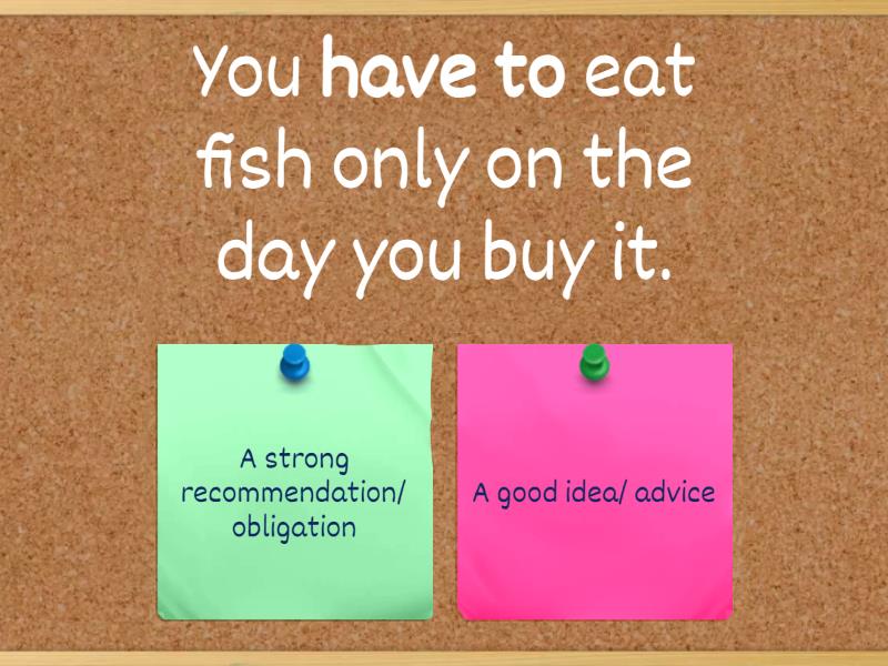 1) You have to eat fish only on the day you buy it. a) A strong recommendation/ obligation b) A good idea/ advice 2) You must always cook meat until it isn't pink . a) A strong recommendation/ obligation b) A good idea/ advice 3) I shouldn't eat dairy products. I'm allergic to them. a) A good idea/Advice b) prohibition 4) I have to start my day with coffee or I'm in a bad mood a) A strong recommendation/rule b) A good idea/ advice 5) You should have a BBQ for a a summer picnic. Everybody loves it! a) A strong recommendation/ obligation b) A good idea/ advice 6) My doctor said I mustn't eat too much at night. It's bad for my digestion. a) A strong recommendation/prohibition b) A good idea/ advice 7) Experts say we shouldn't have dinner after 7pm. It's not good for our health. a) A strong recommendation/ prohibition b) A good idea/ advice 8) You don't have to buy everything organic, but it's a good idea. a) A strong recommendation/ prohibition b) It's not necessary, there is no obligation 9) We all must recycle waste a) A strong obligation b) A good idea/ advice