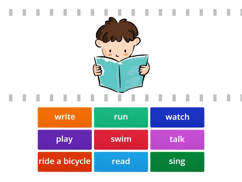 read, swim, write, sing, talk, watch, run, ride a bicycle, play ,