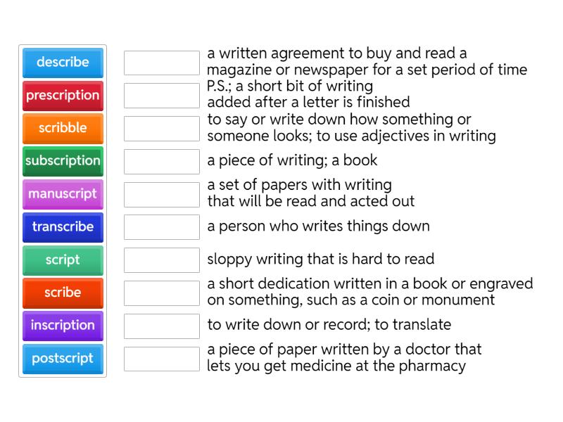 describe - to say or write down how something or someone looks; to use adjectives in writing, inscription - a short dedication written in a book or engraved on something, such as a coin or monument, manuscript - a piece of writing; a book, postscript - P.S.; a short bit of writing added after a letter is finished, prescription - a piece of paper written by a doctor that lets you get medicine at the pharmacy, scribble - sloppy writing that is hard to read, scribe - a person who writes things down, script - a set of papers with writing that will be read and acted out, subscription - a written agreement to buy and read a magazine or newspaper for a set period of time, transcribe - to write down or record; to translate,