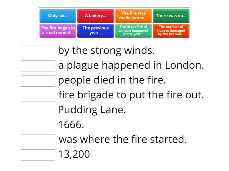 The Great Fire of London happened in the year... - 1666., The fire began in a road named... - Pudding Lane., The previous year... - a plague happened in London., The number of houses damaged by the fire was... - 13,200, A bakery... - was where the fire started., Only six... - people died in the fire., The fire was made worse... - by the strong winds., There was no... - fire brigade to put the fire out.,