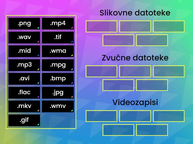 Slikovne datoteke: .jpg, .png, .bmp, .gif, .tif, Zvučne datoteke: .mp3, .wav, .mid, .wma, .flac, Videozapisi: .mpg, .mkv, .mp4, .wmv, .avi,