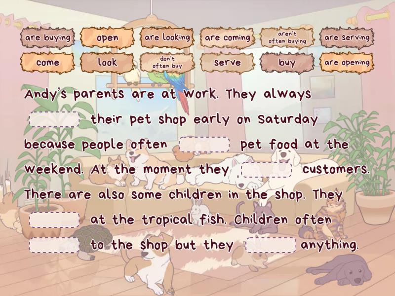 Andy’s parents are at work. They always ____ their pet shop early on Saturday because people often ____ pet food at the weekend. At the moment they ____ customers. There are also some children in the shop. They ____ at the tropical fish. Children often ____ to the shop but they ____anything.