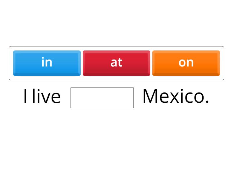 I live ____ Mexico. My friend works ____ Walmart. I live ____ Independencia Avenue. Thousands of elephants live ____ Africa. Robert studies languages____ Spain. My dad has a pizza store ____Lima Street. Come visit us ____ #105 Dorado Street, San Juan. He works ____ Benito Juarez street ____ Papa John's Pizza. I live in Jalisco, and my friend lives ____ Oaxaca. I work ____ a bank ____ Monterrey. I play soccer with my friends ____ our neighborhood. The building is ____ Alvaro Obregon's Avenue. The traffic ____ the road is crazy! Jennifer is ____ Tokyo right now. See me ____ 313 Rosales St.