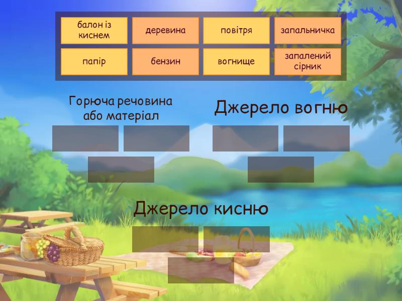 Горюча речовина або матеріал: бензин, папір, деревина, Джерело вогню: запалений сірник, вогнище, запальничка, Джерело кисню: балон із киснем, повітря,