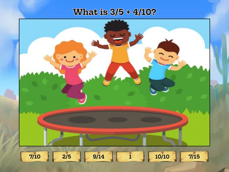 1) What is 3/5 + 4/10? a) 7/10 b) 2/5 c) 9/14 d) 1 e) 10/10 f) 7/15 2) Jake ate 4/9 of a cake and Betty ate 6/18. How much did they eat altogether? a) 7 b) 2/4 c) 10/27 d) 7/9  e) 1 f) 10/18 3) Zack ate 2/6 of a pie and Isabelle ate 4/24. How much pie did they eat? a) 8/32 b) 6/30 c) 7/12 d) 6/13 e) 12/24 f) 10/18 4) Add the yellow and blue together. Choose your answer. a) 5/6 b) 4/6 c) 1/2 d) 1 whole e) 3/5 f) 2/10 5) What is 4/14 - 2/7? a) 17/18 b) 0 c) 7/9 d) 6/12 e) 2/8 f) 2 wholes 6) Which of these fractions is equivalent to 1/10? There is more than 1 answer. a) 2/20 b) 10/100 c) 30/300 d) 50/500 e) 4/40 f) 9/90