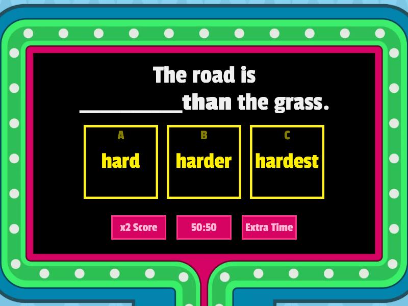 1) It is much _______ today than yesterday. a) cold b) colder c) coldest 2) He is the __________person in class. a) interesting b) more interesting c) most interesting 3) That is the ___________ cat I know! a) bigest b) biggest c) bigger d) biger 4) The road is __________than the grass. a) hard b) harder c) hardest 5) The weather is ________today. a) hot b) hoter c) hotest 6) Tom is getting _________ every day. a) thin b) thiner c) thinner d) thinnest e) thinest 7) That’s the _________song I know. a) sad b) sader c) sadder d) saddest e) sadest 8) James told us the ___________ story in the world. a) funnier than b) funniest c) funiest d) funni 9) Our school got _______ than last year. a) big b) bigger c) biger d) biggest e) the biggesr 10) "I think I am the _________ in the world!" - said Tatiana. a) happy b) hapier c) happier d) hapiest e) happiest
