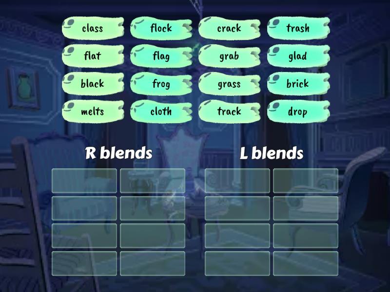 R blends: crack, trash, grab, track, drop, frog, brick, grass, L blends: cloth, flock, flat, glad, flag, melts, class, black,