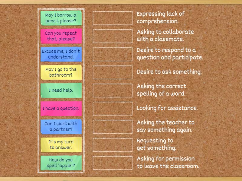 May I go to the bathroom? - Asking for permission to leave the classroom., I have a question. - Desire to ask something., Can you repeat that, please? - Asking the teacher to say something again., How do you spell 'apple'? - Asking the correct spelling of a word., Excuse me, I don't understand. - Expressing lack of comprehension., May I borrow a pencil, please? - Requesting to get something., I need help. - Looking for assistance., It's my turn to answer. - Desire to respond to a question and participate., Can I work with a partner? - Asking to collaborate with a classmate.,
