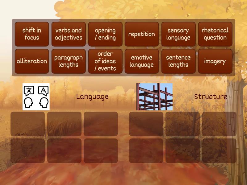 Language: emotive language, rhetorical question, verbs and adjectives, alliteration, imagery, sensory language, Structure: repetition, opening / ending, sentence lengths, paragraph lengths, order of ideas / events, shift in focus,