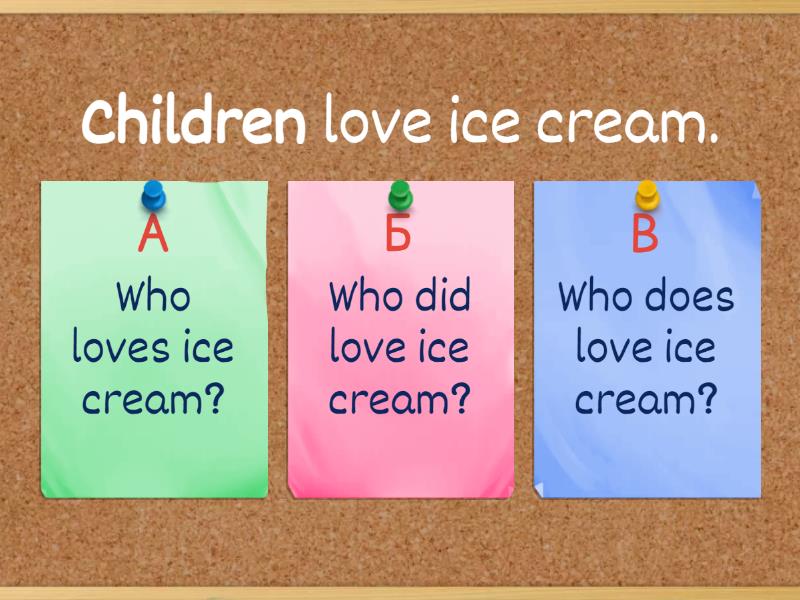 1) Children love ice cream. a) Who loves ice cream? b) Who did love ice cream? c) Who does love ice cream? 2) Children like ice cream. a) What does children like? b) What do children like? c) What children likes? 3) She understood the problem immediately. a) What did understand the problem immediately? b) Who understood the problem immediately? c) What understood the problem immediately? 4) The teacher lived in Leeds many years ago. a) Who you lived 3 years ago? b) Who lived in Leeds 3 years ago? c) Who did live in Leeds? 5) The children did their homework at school. a) What did the children do at school? b) What did the children at school? c) What the children did at school? 6) The police caught the thief last week. a) When did the police caught the thief? b) When did the police catch the thief?  c) When did the thief catch the police? 7) Listening to music released her stress. a) What did release her stress? b) What released her stress? c) What did her stress release? 8) He brought some flowers from the garden. a) Who did bring some flowers from the garden? b) Who brought some flowers from the garden? c) What bring some flowers from the garden? 9) We invited a few friends to our party. a) How many friends we invited to our party? b) How many did friends invite we to our party? c) How many friends did we invite to our party? 10) She cut the trees yesterday. a) What does she cut yesterday? b) What she cut yesterday? c) What did she cut yesterday?