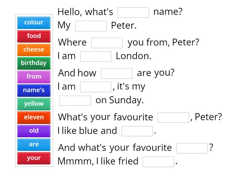 Hello, what's ____ name? My ____ Peter. Where ____ you from, Peter? I am ____ London. And how ____ are you? I am ____, it's my ____ on Sunday. What's your favourite ____, Peter? I like blue and ____. And what's your favourite ____? Mmmm, I like fried ____.