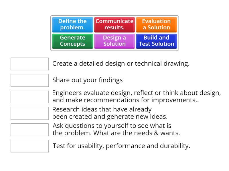 Generate Concepts - Research ideas that have already been created and generate new ideas., Define the problem. - Ask questions to yourself to see what is the problem.  What are the needs & wants., Design a Solution - Create a detailed design or technical drawing., Build and Test Solution - Test for usability, performance and durability., Evaluation a Solution - Engineers evaluate design, reflect or think about design, and make recommendations for improvements.., Communicate results. - Share out your findings,