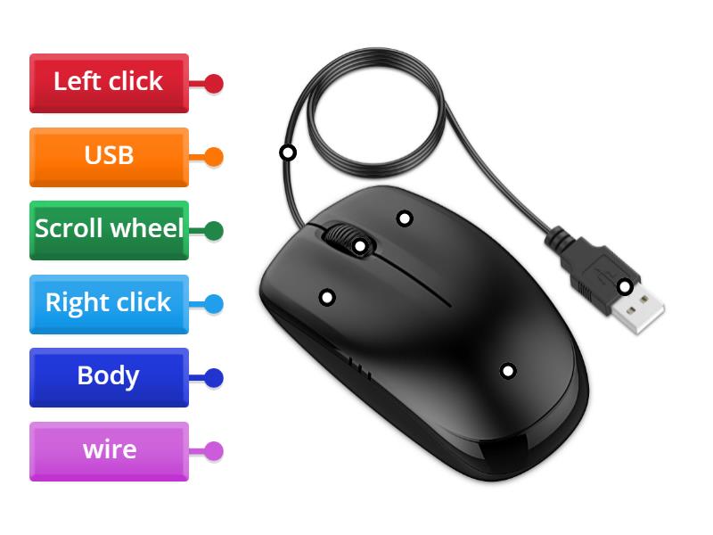 Right click, Left click, USB, Scroll wheel, wire, Body.