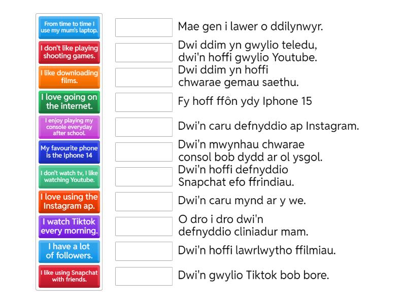 I enjoy playing my console everyday after school. - Dwi'n mwynhau chwarae consol bob dydd ar ol ysgol., I like using Snapchat with friends. - Dwi'n hoffi defnyddio Snapchat efo ffrindiau., I love using the Instagram ap. - Dwi'n caru defnyddio ap Instagram., I love going on the internet. - Dwi'n caru mynd ar y we., My favourite phone is the Iphone 14 - Fy hoff ffôn ydy Iphone 15, I don't like playing shooting games. - Dwi ddim yn hoffi chwarae gemau saethu., From time to time I use my mum's laptop. - O dro i dro dwi'n defnyddio cliniadur mam., I like downloading films. - Dwi'n hoffi lawrlwytho ffilmiau., I watch Tiktok every morning. - Dwi'n gwylio Tiktok bob bore., I don't watch tv, I like watching Youtube. - Dwi ddim yn gwylio teledu, dwi'n hoffi gwylio Youtube., I have a lot of followers. - Mae gen i lawer o ddilynwyr.,