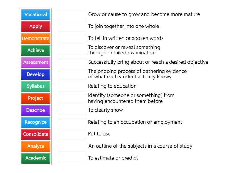Syllabus - An outline of the subjects in a course of study, Develop - Grow or cause to grow and become more mature, Achieve - Successfully bring about or reach a desired objective, Academic - Relating to education , Vocational - Relating to an occupation or employment, Consolidate - To join together into one whole, Assessment - The ongoing process of gathering evidence of what each student actually knows,, Project - To estimate or predict, Analyze - To discover or reveal something through detailed examination, Recognize - Identify (someone or something) from having encountered them before, Demonstrate - To clearly show, Apply - Put to use, Describe - To tell in written or spoken words,
