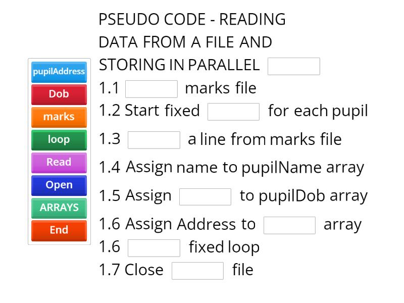 PSEUDO CODE - READING DATA FROM A FILE AND STORING IN PARALLEL ____ 1.1 ____ marks file 1.2 Start fixed ____ for each pupil 1.3 ____ a line from marks file 1.4 Assign name to pupilName array 1.5 Assign ____ to pupilDob array 1.6 Assign Address to ____ array 1.6 ____ fixed loop 1.7 Close ____ file ____ get_results(ByRef pupilNames() As String, ByRef prelimMarks() As Integer, ByRef courseworkMarks() As Integer) 'reads data into ____ arrays from a sequential file Dim fullLine(2) As String ____(3, "C:\\prelimData.csv", OpenMode.____) For i = 0 To 14 fullLine = LineInput(3).Split(",") pupilNames(i) = tempArray(____) prelimMarks(i) = tempArray(____) courseworkMarks(____) = tempArray(____) ____ FileClose(____) ____ Sub