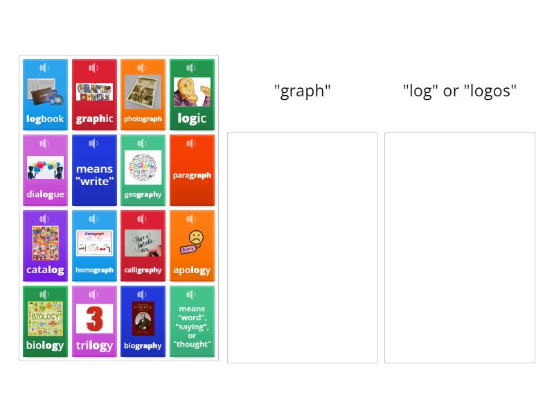 "graph": means "write", homograph, paragraph, biography, graphic, geography, photograph, calligraphy, "log" or "logos": means "word", "saying", or "thought", apology, trilogy, logbook, dialogue, logic, biology, catalog,