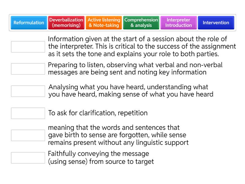 Interpreter Introduction - Information given at the start of a session about the role of the interpreter. This is critical to the success of the assignment as it sets the tone and explains your role to both parties., Active listening & Note-taking - Preparing to listen, observing what verbal and non-verbal messages are being sent and noting key information, Comprehension & analysis - Analysing what you have heard, understanding what you have heard, making sense of what you have heard, Intervention - To ask for clarification, repetition , Deverbalization (memorising) - meaning that the words and sentences that gave birth to sense are forgotten, while sense remains present without any linguistic support, Reformulation - Faithfully conveying the message (using sense) from source to target,