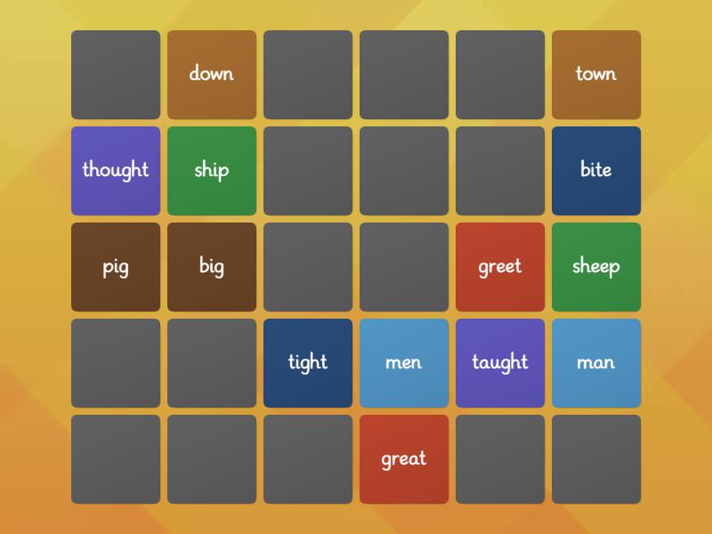 ship - sheep, taught - thought, greet - great, man - men, big - pig, tight - bite, town - down, toast - ghost, boat - goat, two - zoo, dough - show, box - socks, dirty - thirty, these - keys, boo - shoe,