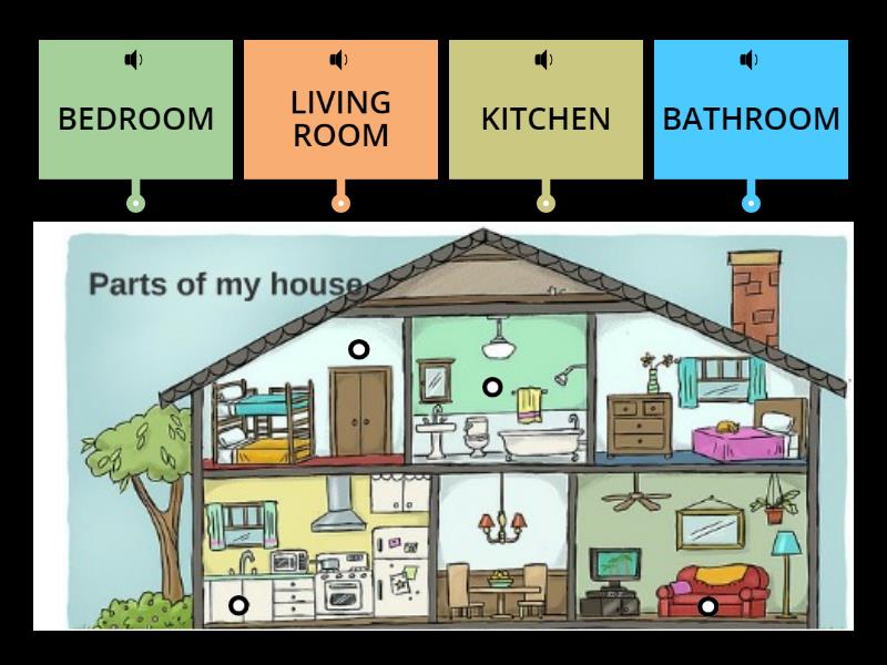 LIVING ROOM, BEDROOM, BATHROOM, KITCHEN.