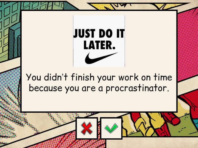 You didn’t finish your work on time because you are a procrastinator. - If you weren’t such a procrastinator, you would have finished your work on time, You were late for a kick-off meeting. Now, you don’t know the details of the project. - If you hadn´t been late for the kick-off meeting, you´d know the details of the project now., You should be participating in a business meeting now, but you are not. Your taxi didn´t come on time. - If your taxi had come on time, you would be participating in the meeting now., You are a really good worker. You got promoted. - If you weren´t a good worker, you wouldn´t have gotten promoted., You don’t know German well enough. You didn’t get a new job because the company language is German. - If you knew German well enough, you would have gotten the job., You missed the dentist appointment because you overslept. - If you hadn´t overslept, you wouldn't have missed your dentist appointment., She didn´t say yes; that´s why we aren´t getting married now. - We would be getting married now if she had said yes., You didn´t play because you are injured. - If you weren't injured, you would have played., I didn´t say hi to her because I don´t know her. - If I knew her, I would have said hi.,