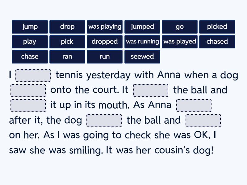 I ____ tennis yesterday with Anna when a dog ____ onto the court. It ____ the ball and ____ it up in its mouth. As Anna ____ after it, the dog ____ the ball and ____ on her. As I was going to check she was OK, I saw she was smiling. It was her cousin’s dog!
