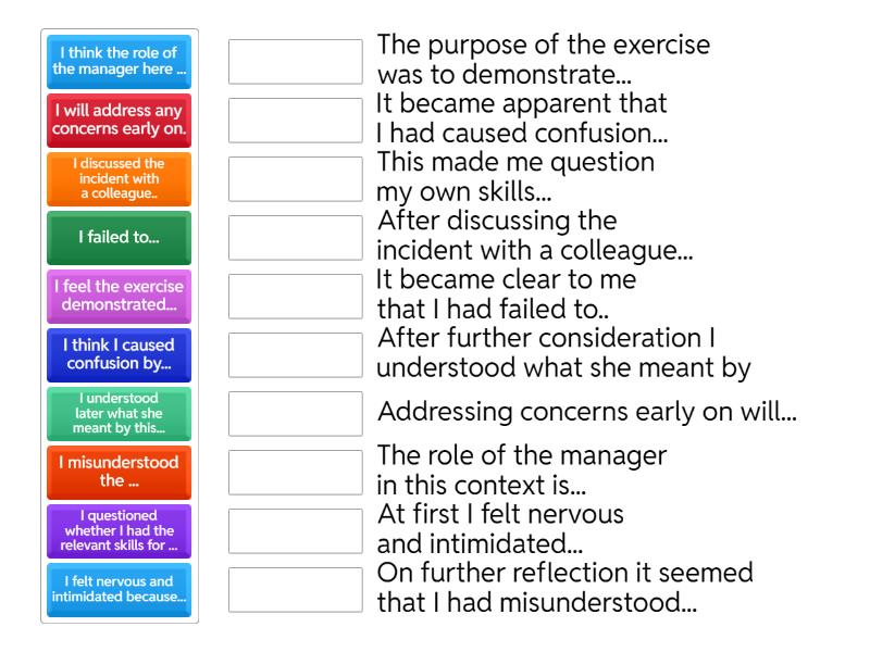 I will address any concerns early on. - Addressing concerns early on will..., I questioned whether I had the relevant skills for ... - This made me question my own skills..., I feel the exercise demonstrated... - The purpose of the exercise was to demonstrate..., I felt nervous and intimidated because... - At first I felt nervous and intimidated..., I think I caused confusion by... - It became apparent that I had caused confusion..., I discussed the incident with a colleague.. - After discussing the incident with a colleague..., I misunderstood the ... - On further reflection it seemed that I had misunderstood..., I failed to... - It became clear to me that I had failed to.., I think the role of the manager here ... - The role of the manager in this context is..., I understood later what she meant by this... - After further consideration I understood what she meant by,