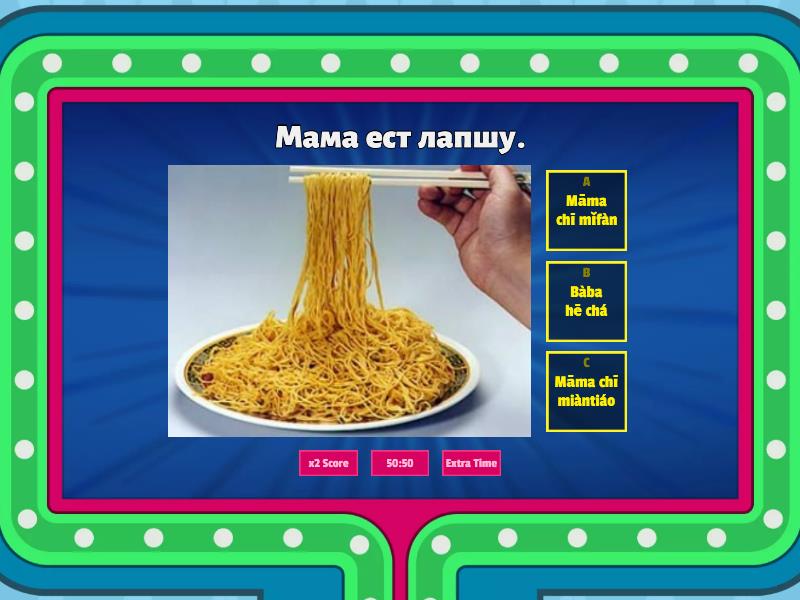 1) Мама ест лапшу. a) Māma chī mǐfàn b) Bàba hē chá c) Māma chī miàntiáo 2) Папа не ест пельмени. a) Māma bù chī jiǎozi b) Jiějie chī mǐfàn c) Bàba bù chī jiǎozi 3) Старшая сестра пьёт зелёный чай. a) Jiějie hē lǜchá b) Mèimei hē shuǐ c) Gēge hē hóngchá 4) Старший брат ест рис. a) Mèimei hē hóngchá b) Gēge chī mǐfàn c) Gēge chī miàntiáo 5) Лань Лань пьёт воду. a) Dìdi hē shuǐ b) Māma bù hē shuǐ c) Lánlan hē shuǐ 6) Младший брат не пьёт черный чай. a) Mèimei hē hóngchá b) Dìdi bù hē hóngchá c) Gēge chī mǐfàn